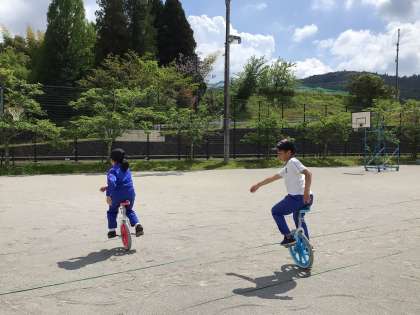 一輪車をする子も多くいました。今日は、2、4年生の子たちが乗っていました。徐々にスイスイ乗れるようになってきて、やりがいがあるそうです。