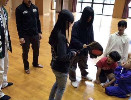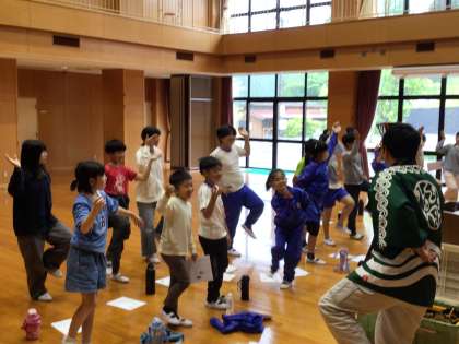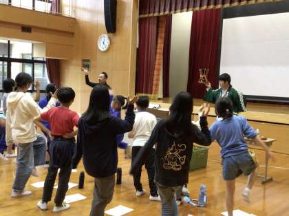保存会の方をお招きし、動画の視聴や、鼓や扇子を手に取らせていただいたり、七福神の動きを教えていただいたりしました。体験活動の一部を1・2年生の子たちも見学させていただきました。