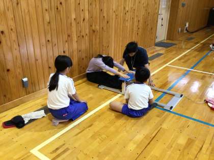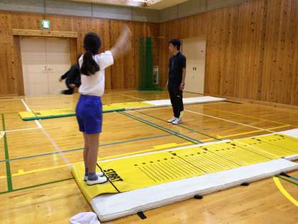 5、6年生の体育では、立ち幅跳びと長座体前屈をしました。