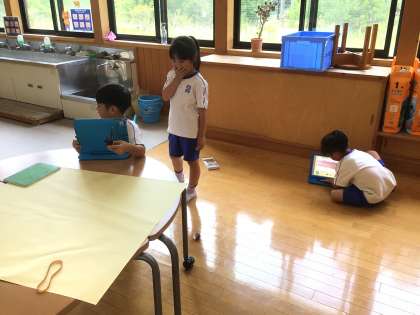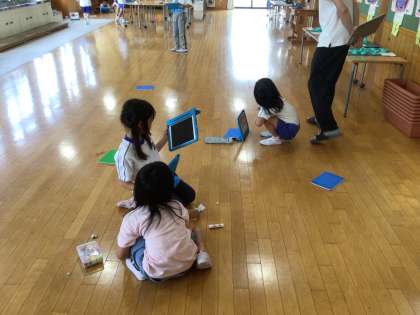 1、2年生はタブレットを使ってアニメーションづくりに取り組んでいます。少しづつ動かして写真を撮ることでアニメーションをつくっていきます。みんな楽しそうです。
