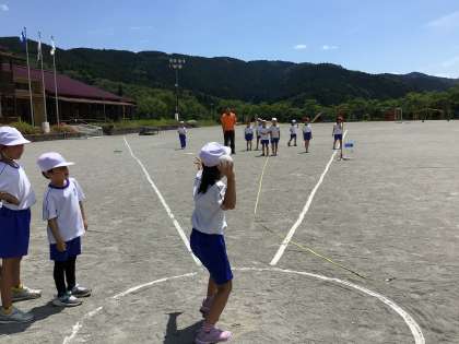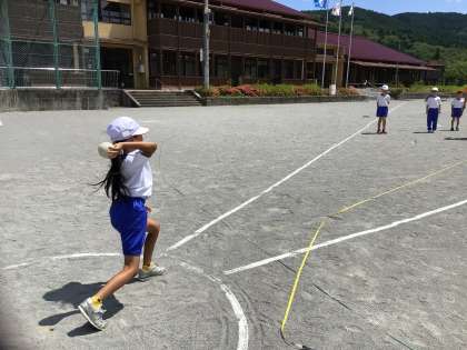 運動場で、ソフトボール投げをしました。