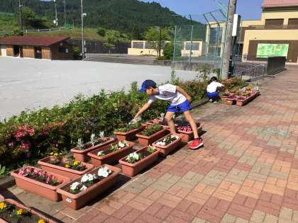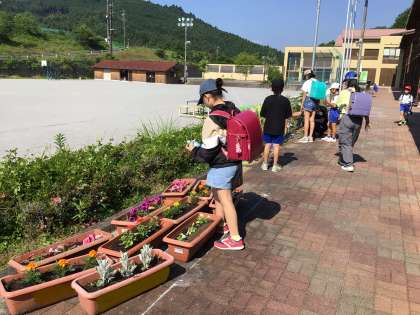 朝、学校に着くとすぐにプランターの様子を見る子どもたちがたくさんでした。