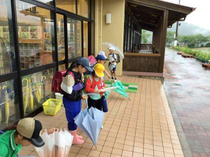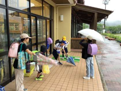 子どもたちは、傘の雨粒をしっかりと落として校舎に入りました。