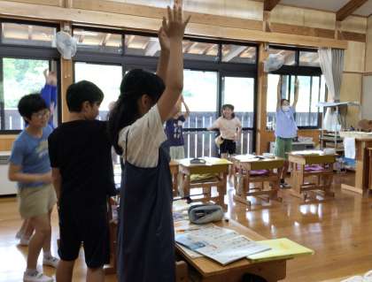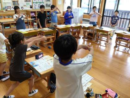 動きを表す言葉の言い方を先生から質問され、子どもたちはジェスチャーをつけて英語で答えました。