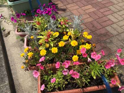 猛暑が続いていますが、子どもたちのプランターの花々は、暑さに負けず、色とりどりに咲いています。