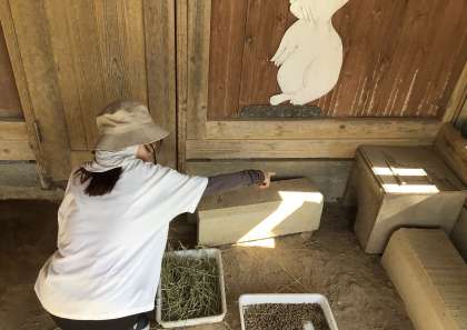 ウサギのくるみは、小屋の奥でじっとして暑さをしのいでいるようです。