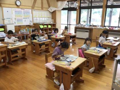 今日は久しぶりの給食です。みんな美味しそうにもくもくと食べています。給食の時間の校内放送もハキハキとできていました。