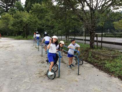 一輪車に乗ったり、遊具で遊んだり、バスケットボールをしたりして、笑顔いっぱいです。