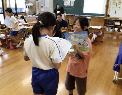 教室を自由に歩き回って、たくさんの友達と英語で会話していました。楽しそうですね。