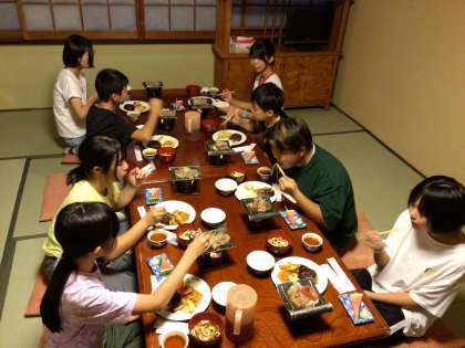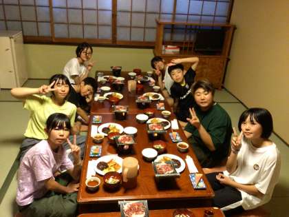 旅館で夕食をおいしく頂きました。 みんな元気です。