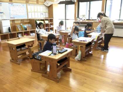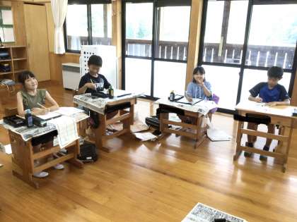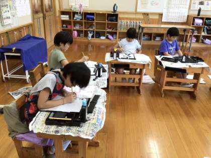 1年生は漢字の勉強に集中して取り組んでいました。4年生は習字です。新しい文字を丁寧に書いています。
