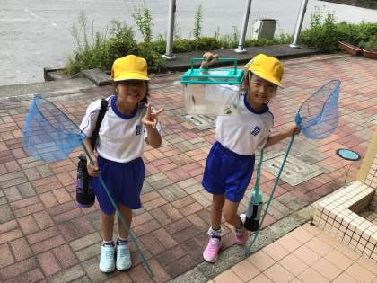 校庭で、バッタを捕まえました。