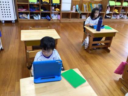 教室に戻ったら、早速バッタの飼い方をタブレットで調べていました。