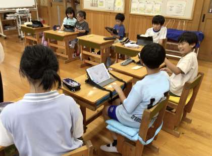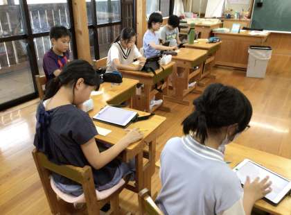 キャンプファイヤーの出し物について、何がよいかと話し合ったり、タブレットで調べたりしました。