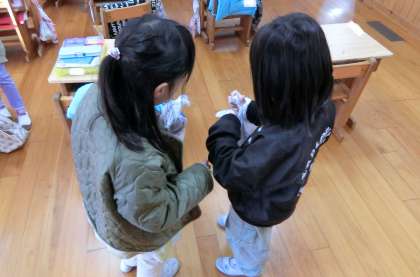 1年生の教室に入ると、リボンやモール、折り紙などを互いに見せ合っていました。