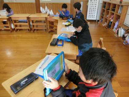 九九表をみて覚えたり、タブレットのデジタルドリルの問題を解き進めたり、先生に九九を唱えて聞いてもらったり。