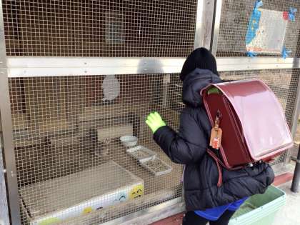 下の写真は、ウサギ小屋に立ち寄ってウサギの様子を見ているところです。