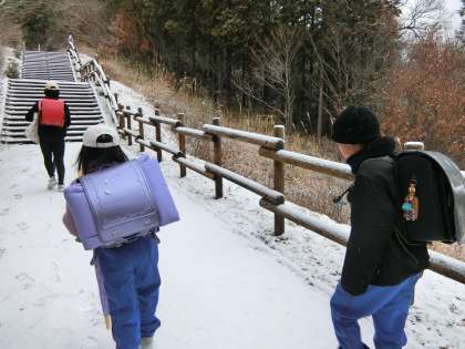 今日は雪が降っていて、あじさい坂は真っ白です。