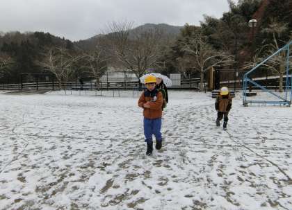 子どもたちは、積もった雪で遊ぼうと楽しそうにしています。