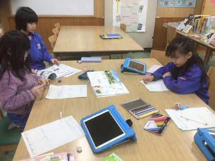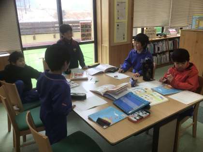 2年生は生活の時間におもちゃ作りに取り組んでいます。図書室でどんなおもちゃを作ろうか話し合っています。楽しそうです。