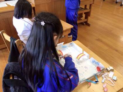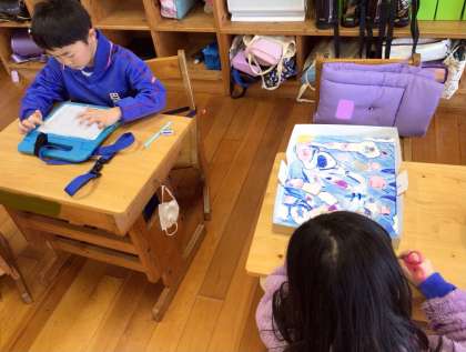 早く作品が出来上がった子は、タブレットでプログラミングをしました。