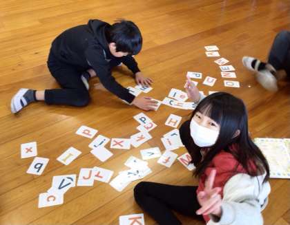 一文字ずつ書かれたカードを組み合わせて、英単語を完成させるゲームをしました。