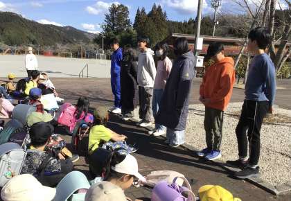 写真は、6年生の子たちが在校生に「使ってください」と話している様子です。