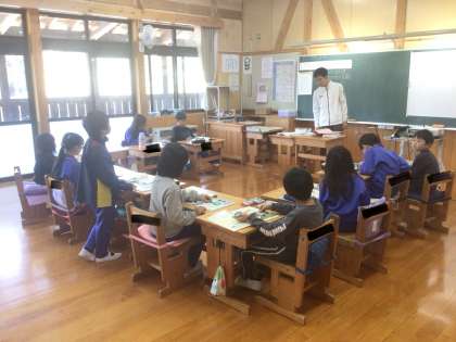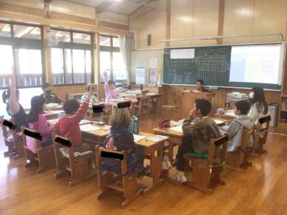 3年生は理科で虫眼鏡の使い方について、4年生は算数に取り組んでいます。両学年とも積極的に挙手をしています。やる気を感じます。