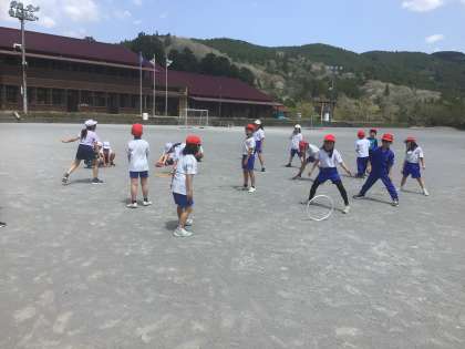 3、4年生は体育の授業に取り組んでいました。輪を転がして、友達の足の下を上手に通せるかな?
