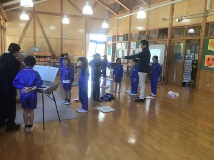1時間目、ワークスペースから元気な歌声が聞こえてきました。1、2年生が音楽で校歌の練習をしていました。朝からさわやかな気持ちになりました。
