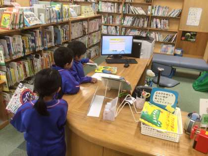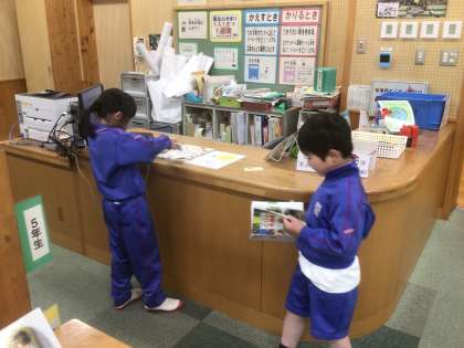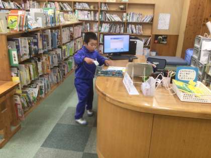 1年生が朝の活動で図書室に本を借りにきていました。みんな上手にバーコードを読み込んで借りることができていました。