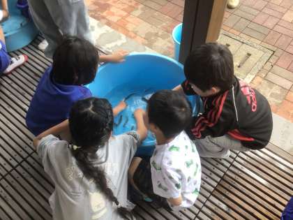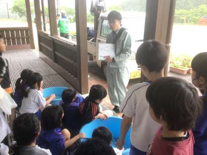 今日はあいにくの雨ため、放流体験は中止でした。代わりに漁業組合の方に持ってきていただいた鮎と触れ合いました。鮎のことも勉強しました。地域コーディネーターの方も参加していただき、楽しい時間となりました。