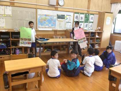 「花いっぱいのうるおいのある学校づくり」をテーマに子どもたちが花を育てて学校を飾る、チームプランターづくりに取り組みました。まずは環境美化委員を中心に、通学班でどんなチームプランターにするか話し合っています。