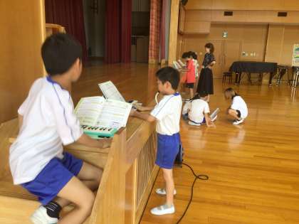 鍵盤ハーモニカの練習をしています。多目的教室でグループになって教えあっています。