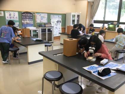 顕微鏡でめだかのたまごの成長の様子を観察しています。