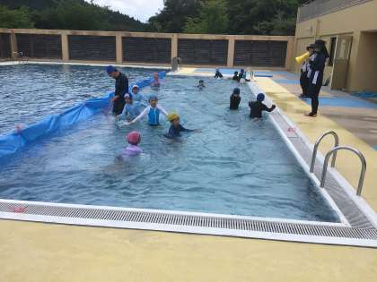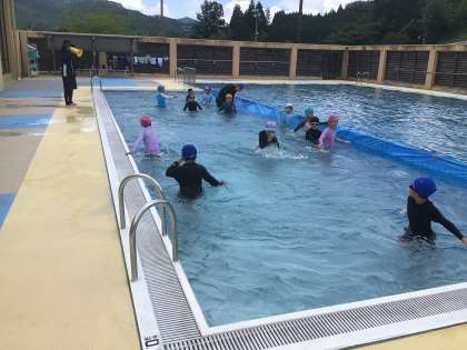 プールの周りをみんなで歩いて流れるプールをつくっています。みんな楽しそうに取り組んでいます。