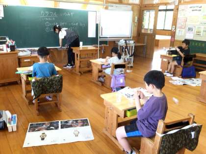 コップにいろんな種類の色水を作ります。まずは、自分のコップに名前を書いているところです。