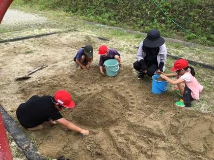 1年生は図工「すなや つちと なかよし」に取り組んでいます。砂場で町を作っています。この後水を流して川も作る予定です。思い思いに発想を広げて作っています。