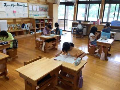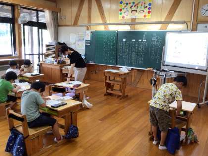 1時間目、1年生は文章を書く練習をしています。2年生は漢字のテストです。集中して取り組んでいます。