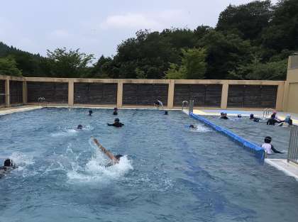 昨日は暑さのため入れませんでしたが、今日は入れました。高学年は大きい方のプールでクロールなどの練習をしています。低学年は小さい方のプールで活動します。