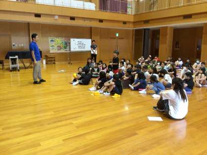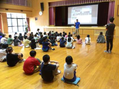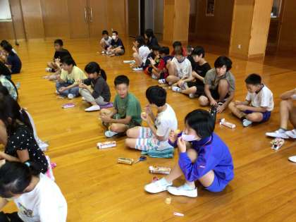 放課中に緊急地震速報が流れたことを想定して訓練しました。子ども同士お互いに呼びかけあって避難している姿が印象的でした。その後、いざという時の防災倉庫の役割について学習をし、実際に防災倉庫の中にある非常食を試食しました。
