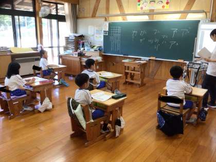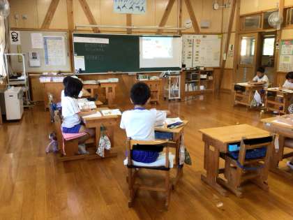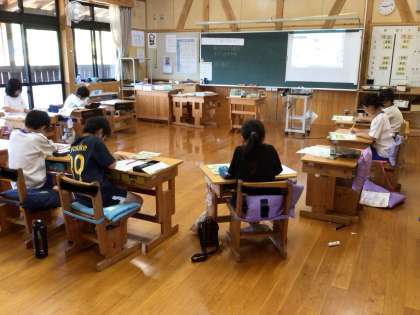 1年生は国語で朗読を静かに聞いています。3年生は算数で巻き尺の使い方をノートにまとめています。