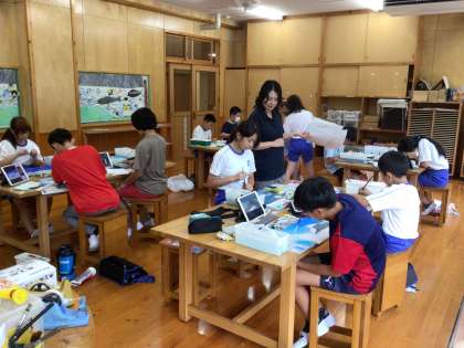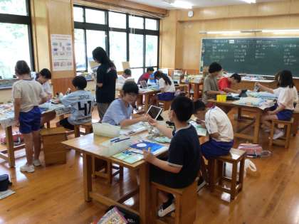 芸術作品を鑑賞したことを生かして、水彩絵の具で空を描いています。楽しい作品がたくさんできました。