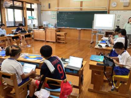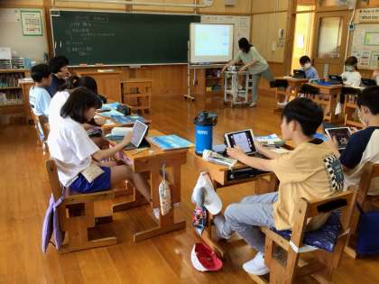 出来上がった作品の説明文を書いています。出来上がった作品はタブレットで写真撮影をして提出します。