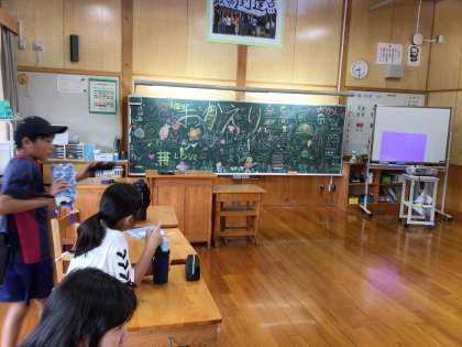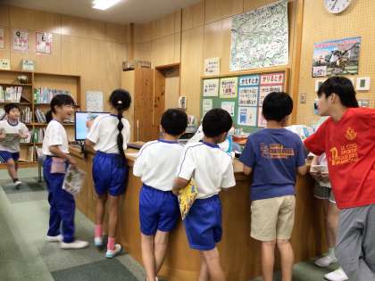 修学旅行から帰ってきた6年生の教室の黒板に後輩たちから温かいメッセージが書かれていました。図書室はいつものようににぎわっています。