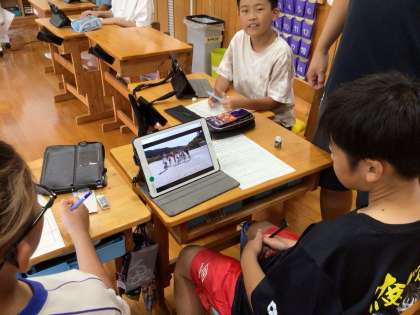 6年生が運動場の真ん中に円を書いて一輪車の練習をはじめました。終わってからタブレットで撮影した動画をみて研究しています。後輩に教えなければならないので、一生懸命に考えているようです。