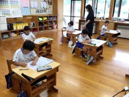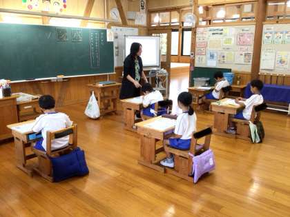 1年生が書写の時間にカタカナを練習しています。終わった子は自分の名前を練習しています。