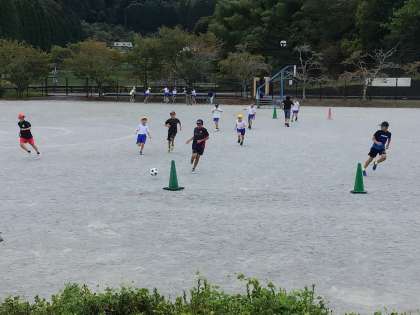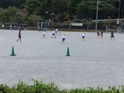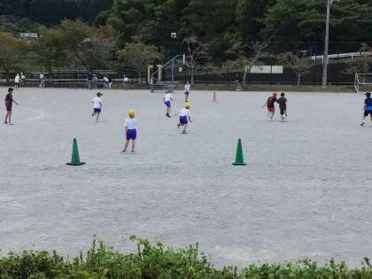 放課の様子です。運動会の練習のためにサッカーゴールは片付けられましたが、コーンを置いてサッカーを楽しんでいます。高学年の子は低学年を気遣いながら一緒にサッカーをしています。