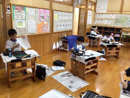 「木」という字を練習しています。よく集中しています。