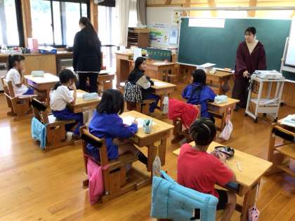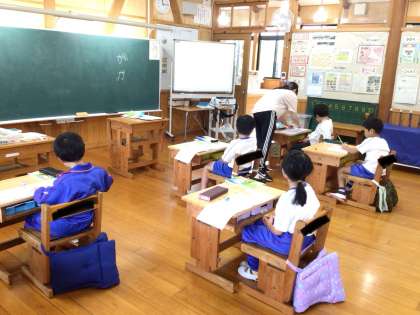 1年生はカタカナの「カ」の練習をしています。2年生は「九九覚えたよカード」が配られました。やり方の説明を聞いています。